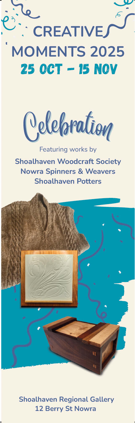 We hope you’ll come along for the ride.Don’t miss a chance to discover pieces from your local creative groups with a collection of creations from the Shoalhaven Woodcraft Society, Nowra Spinners and Weavers, and the Shoalhaven Potters.Creative Moments 2025